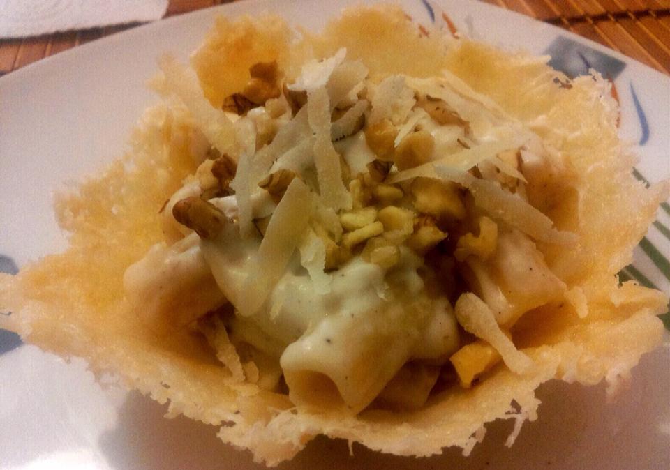 Intertempe ni preparu la pastaĵo. Ni verŝu iom da oleo en pato kaj ni metu kuiru la fungojn por ĉirkaŭ 20 minutoj. Kiam la la fungoj estos pretaj, ni elŝaltu la varmegon kaj ni aldonu la nuksojn. Poste ni senakvigu la pastaĵon kaj ni metu ĝin kun la fungoj, la nuksoj kaj la beŝamelo, kaj ni miksu bone. Fine, ni metu la pastaĵon en la korbetoj kaj ni servu kun kelkaj skvamparmesano.