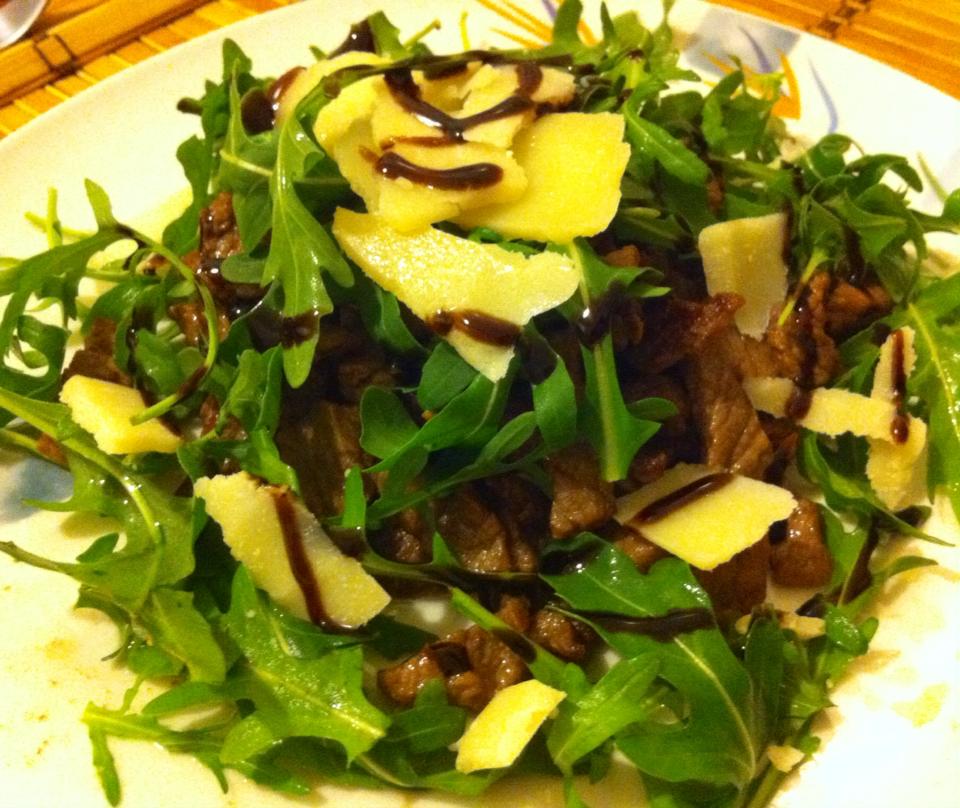 Ni tranĉu la viandon de bovido en multaj strioj kaj ni metu la poton kun olivoleo sur la fajron. Ni kuiru dum kelkaj minutoj kaj ni metu la salon. Dume ni lavu kaj ni sekigu la erukon. Kiam la viando estas preta, en plado ni aldonu la erukon kaj Pad-valan fromaĝon en grandaj skvamoj. Ni kondimentu kun la balzama vinagro.