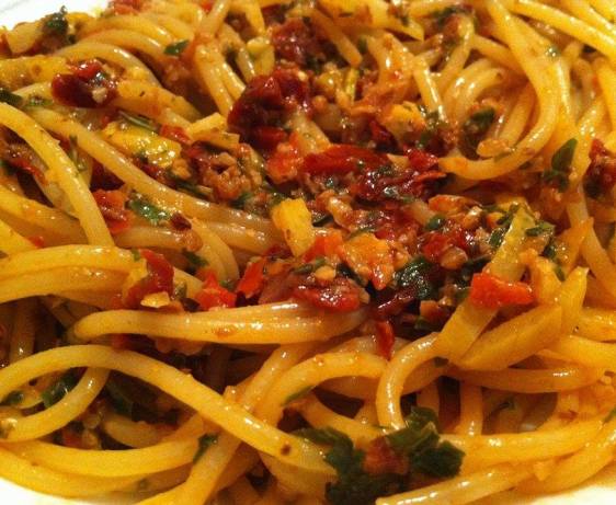 PASTO KUN PESTITA SAŬCO DE SEKIGITAJ TOMATOJ, JUGLANDOJ KAJ BAZILIO